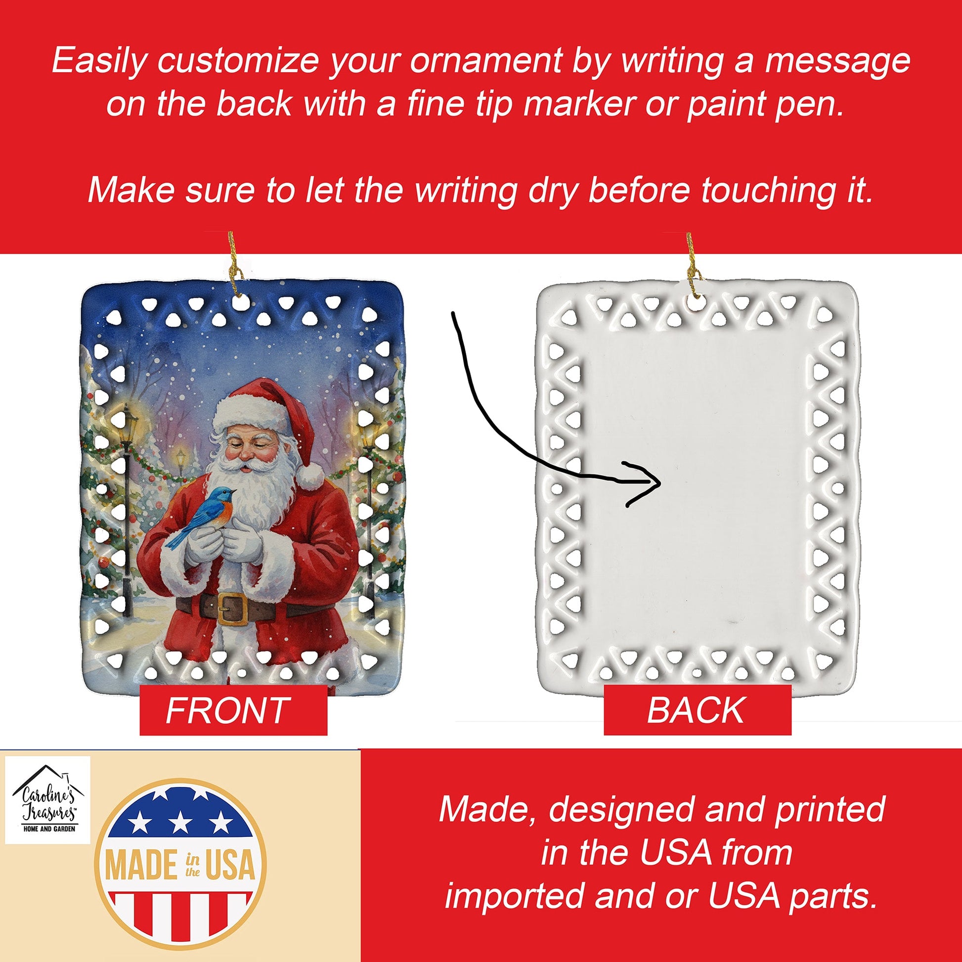 Porcelain Ornament featuring breed specific Bluebird artwork. Celebrate Christmas with this Christmas Ornament. Add a unique, personal touch to your holiday decor with our Rectangular Lattice Porcelain Ornament. Perfect for creating cherished memories, this high-quality ornament shines under festive lights, reflecting warmth and joy throughout your Christmas tree. Crafted with a glossy finish, it showcases vibrant, full-color artwork contributed by our talented artists, ensuring your tree is adorned with a burst of color and holiday spirit. What sets this Porcelain Ornament apart is its customizable white back. Use a paint pen or permanent marker to write a heartfelt message, commemorate a special year, or mark an unforgettable date, turning this ornament into a keepsake that will be treasured for years to come. For best results, allow any personalization to dry thoroughly before handling. Each ornament comes complete with a delicate gold cord, making it easy to hang and display. Proudly made in the USA, this ornament measures 3.375 x 2.625 inches and is a thoughtful gift for pet sitters, teachers, family members, or anyone who would appreciate a little extra holiday magic. Bring style, charm, and a touch of personal meaning to your Christmas tree with this beautifully designed ornament..