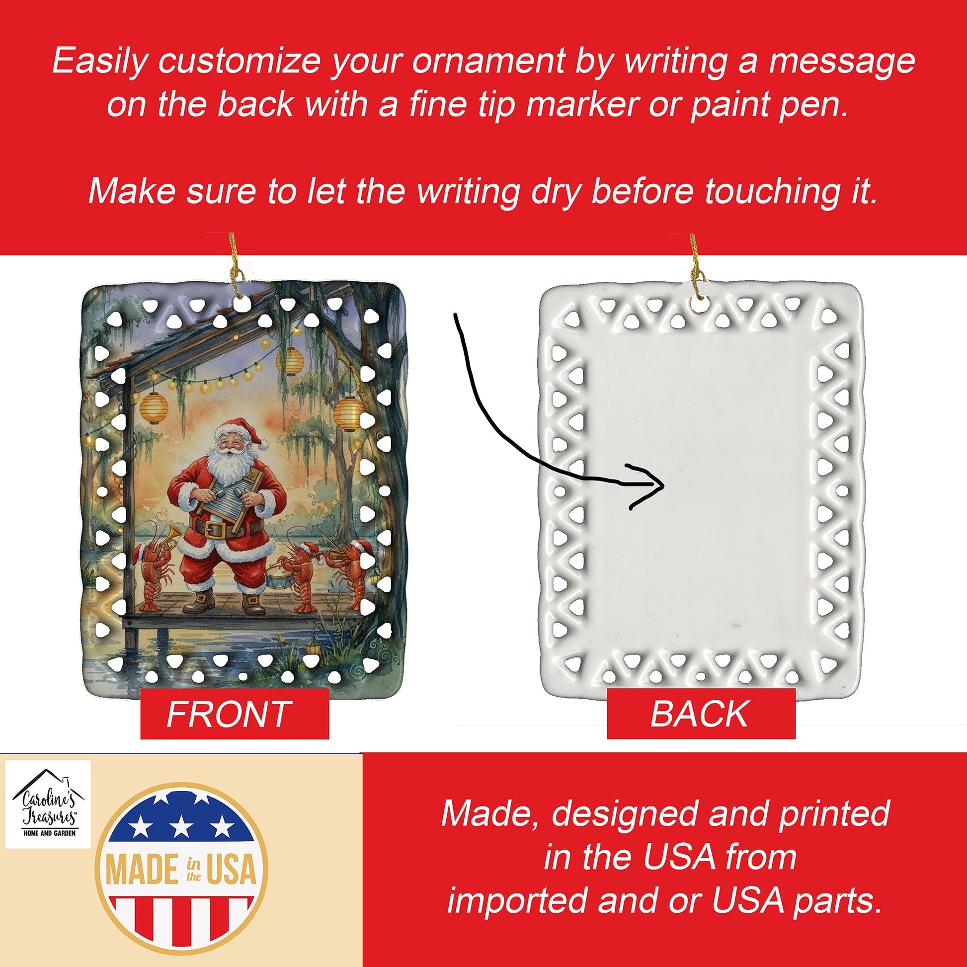 Celebrate Christmas with this Christmas Ornament. Add a unique, personal touch to your holiday decor with our Rectangular Lattice Porcelain Ornament. Perfect for creating cherished memories, this high-quality ornament shines under festive lights, reflecting warmth and joy throughout your Christmas tree. Crafted with a glossy finish, it showcases vibrant, full-color artwork contributed by our talented artists, ensuring your tree is adorned with a burst of color and holiday spirit. What sets this Porcelain Ornament apart is its customizable white back. Use a paint pen or permanent marker to write a heartfelt message, commemorate a special year, or mark an unforgettable date, turning this ornament into a keepsake that will be treasured for years to come. For best results, allow any personalization to dry thoroughly before handling. Each ornament comes complete with a delicate gold cord, making it easy to hang and display. Proudly made in the USA, this ornament measures 3.375 x 2.625 inches and is a thoughtful gift for pet sitters, teachers, family members, or anyone who would appreciate a little extra holiday magic. Bring style, charm, and a touch of personal meaning to your Christmas tree with this beautifully designed ornament..