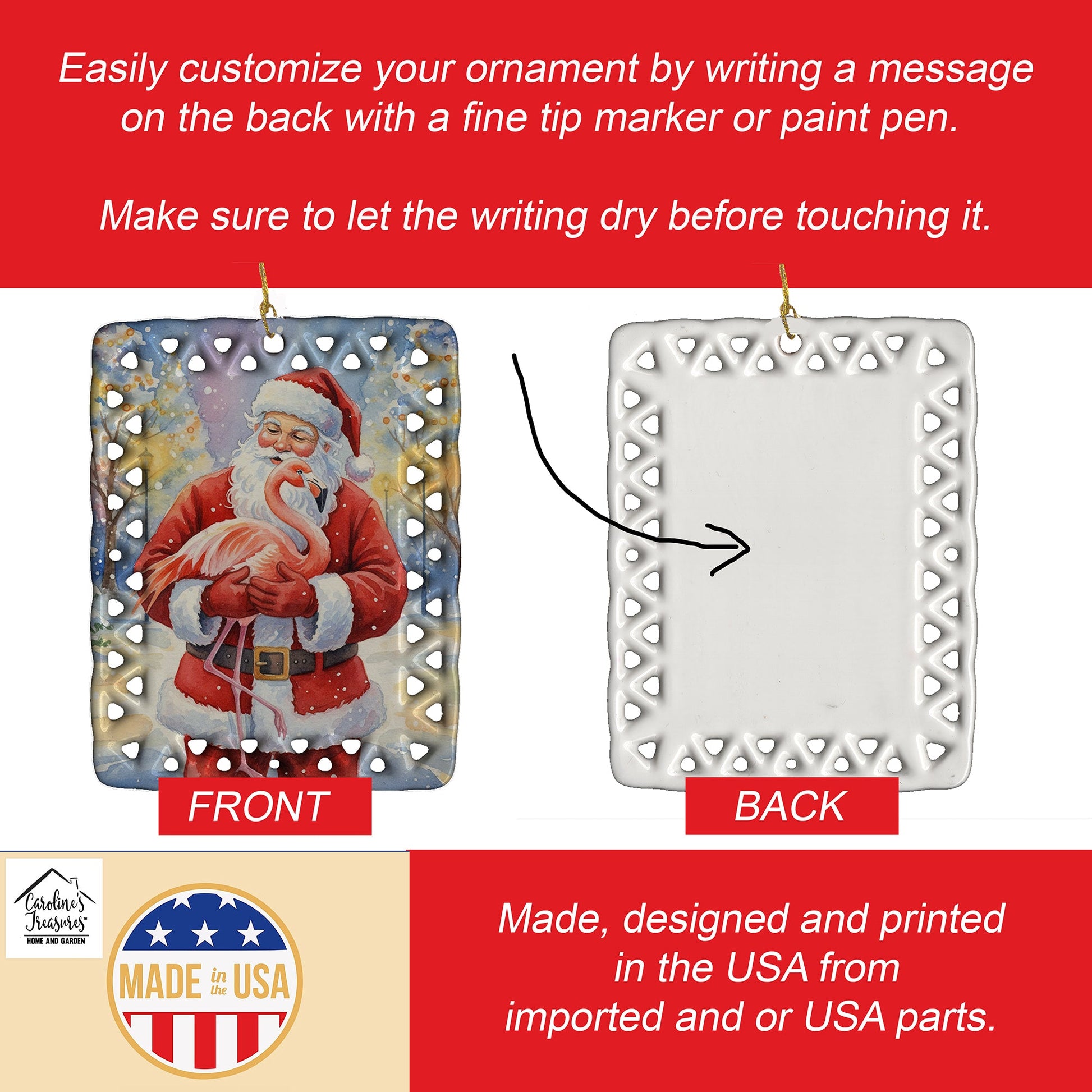 Porcelain Ornament featuring breed specific Flamingo artwork. Celebrate Christmas with this Christmas Ornament. Add a unique, personal touch to your holiday decor with our Rectangular Lattice Porcelain Ornament. Perfect for creating cherished memories, this high-quality ornament shines under festive lights, reflecting warmth and joy throughout your Christmas tree. Crafted with a glossy finish, it showcases vibrant, full-color artwork contributed by our talented artists, ensuring your tree is adorned with a burst of color and holiday spirit. What sets this Porcelain Ornament apart is its customizable white back. Use a paint pen or permanent marker to write a heartfelt message, commemorate a special year, or mark an unforgettable date, turning this ornament into a keepsake that will be treasured for years to come. For best results, allow any personalization to dry thoroughly before handling. Each ornament comes complete with a delicate gold cord, making it easy to hang and display. Proudly made in the USA, this ornament measures 3.375 x 2.625 inches and is a thoughtful gift for pet sitters, teachers, family members, or anyone who would appreciate a little extra holiday magic. Bring style, charm, and a touch of personal meaning to your Christmas tree with this beautifully designed ornament..