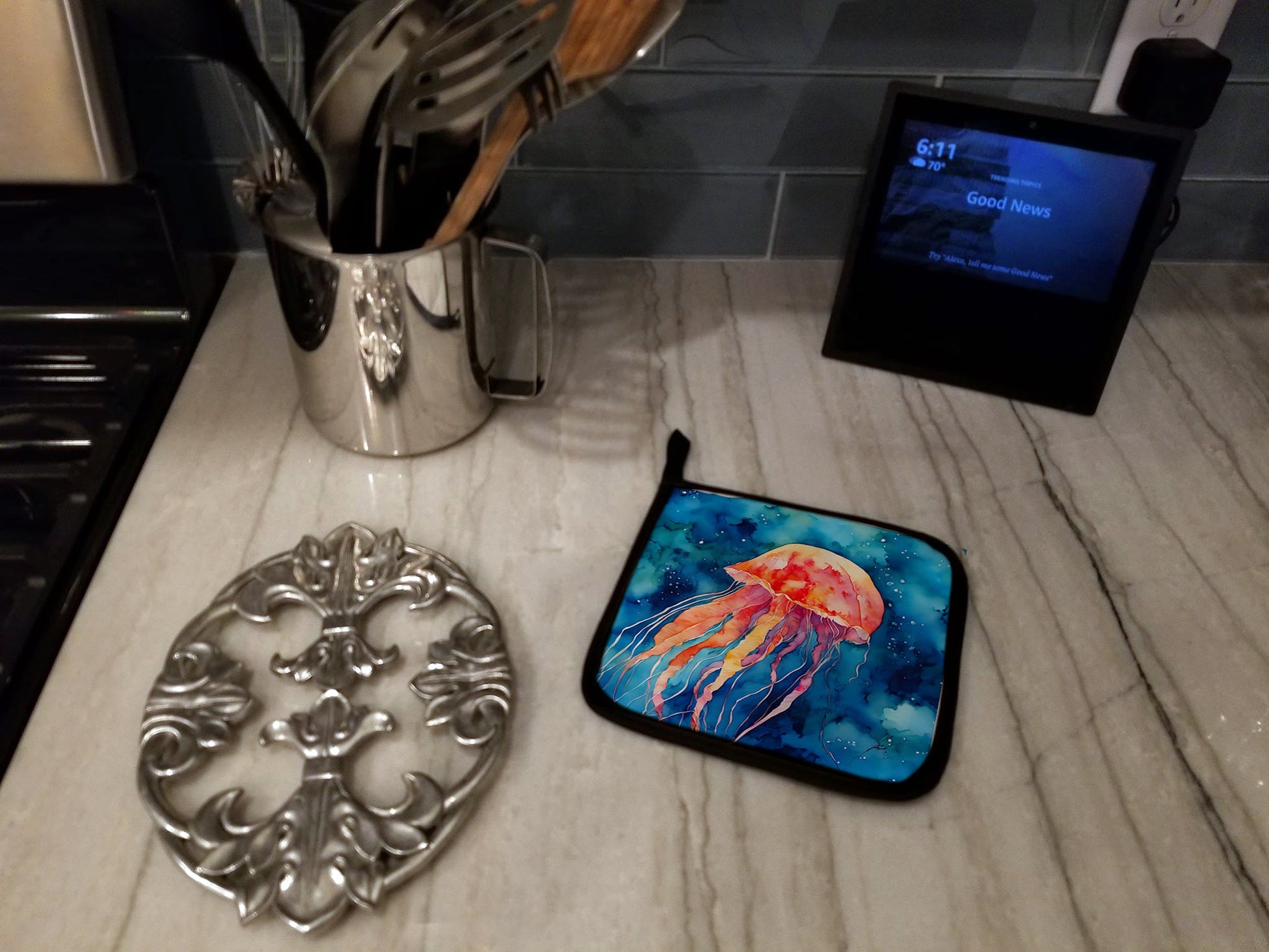 Decorate your space with our Jellyfish artwork on a Pair of Pot Holders. A Pair of Pot Holders to match your kitchen decor. Made in the USA these are thick and functional. Full color artwork decorates the front polyester fabric of the hot pad and accented by a black trim. Use these at as a trivet for your Thanksgiving or Christmas tablescape. Filled with insulated fabric and quilted for durability. These colorful pot holders will make a great gift for your favorite home cook or executive chef. Each pot holder measures approximately 7 1/2 inches by 7 1/2 inches. A hanging tab is included.