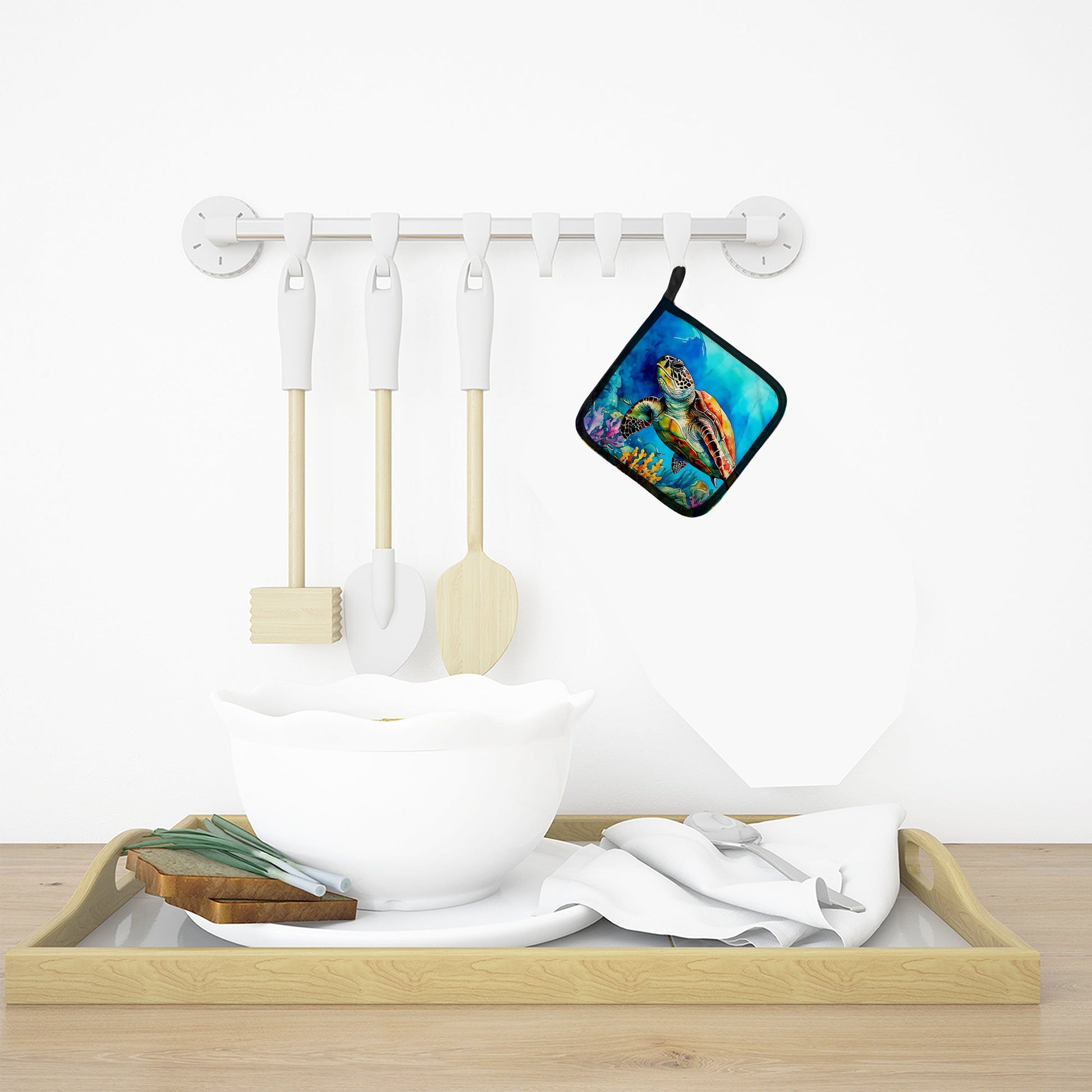 Decorate your space with our Loggerhead Sea Turtle artwork on a Pair of Pot Holders. A Pair of Pot Holders to match your kitchen decor. Made in the USA these are thick and functional. Full color artwork decorates the front polyester fabric of the hot pad and accented by a black trim. Use these at as a trivet for your Thanksgiving or Christmas tablescape. Filled with insulated fabric and quilted for durability. These colorful pot holders will make a great gift for your favorite home cook or executive chef. Each pot holder measures approximately 7 1/2 inches by 7 1/2 inches. A hanging tab is included.