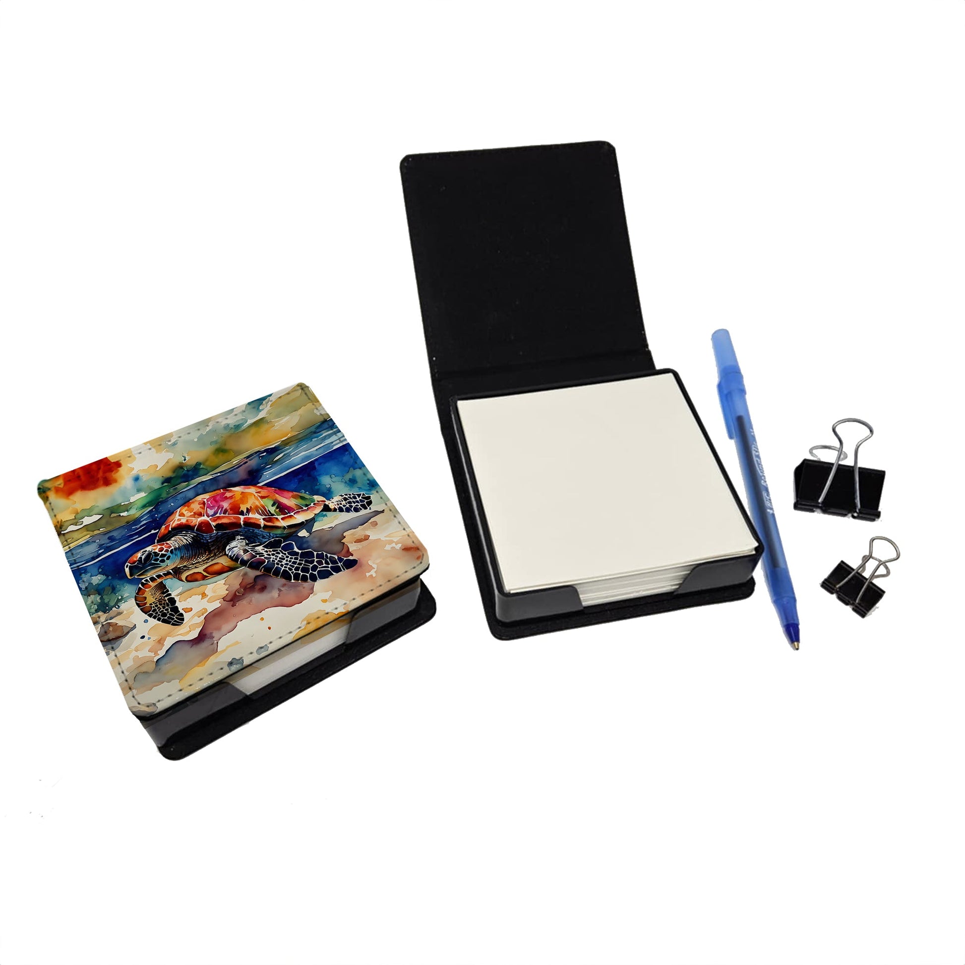 PU Leather Note Paper Holder featuring breed specific Loggerhead Sea Turtle artwork. Elevate your workspace with this PU Leather Note Paper Holder, crafted to resemble luxurious leather without the use of animal products. Made from durable synthetic PU leather, it offers both a premium look and eco-friendly appeal. This note holder, compactly sized at 4.25 x 4.25 x 1.25 inches, includes about 160 sheets of 3.75 x 3.75-inch note paper—ideal for quick notes and reminders. An exclusive artist-designed cover makes each holder uniquely vibrant, adding a splash of color and personality to any desk or office. The discrete design keeps note paper hidden, maintaining a neat and organized workspace. Perfect as a gift or for personal use, this stylish holder is refillable with standard paper, ensuring long-lasting utility. A must-have for anyone seeking a sophisticated, artful touch to their workspace while supporting animal-friendly products. Add style, organization, and creativity to your everyday routine with this elegant note paper holder.